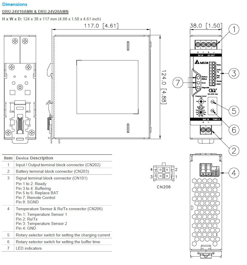 | *3 Do not short battery + and - together to prevent battery explosion. Please add an external overcurrent protective device between the battery and product (BAT.IN connector) to prevent the battery from short-circuiting. Ensure that a suitable charging current is chosen based on the battery’s capability to prevent the battery from overheating. Delta can offer a battery module (DRN-24V7AAEN) for 2 x 12 Vdc / 7.2 AH lead acid battery. The recommended 7.2 AH battery source is Yuasa: NP7-12 & CSB: GP1272F2. *4 The charging current can be adjusted with a four-step rotary selector switch, which will automatically de-rate when Vin < 24 Vdc. *5 Iout = 0 A and without battery charge |